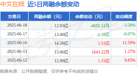 本站消息,6月18日,中文在线(300364)融资买入1.16亿元,融资偿还1.63亿元,融资净卖出4691.7万元,融资余额12.93亿元,近20个交易日中有13个交易日出现融资净买入。